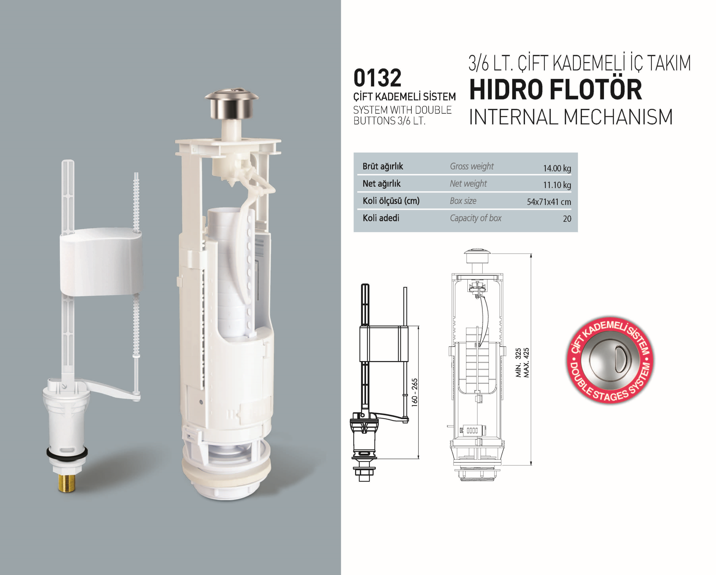 Nkp 3/6 Lt. Çift Kademeli Sistem Hidro Flotör, su tasarrufu sağlayan ve verimli bir kullanım sunan gelişmiş bir üründür. Çift kademeli sistem, ihtiyaca göre 3 veya 6 litre su kullanım seçeneği sunarak, suyun daha verimli kullanılmasını sağlar. Hidro flotör teknolojisi, su seviyesini hassas bir şekilde kontrol eder ve otomatik olarak suyun durmasını sağlar. Bu sayede su israfı engellenir ve uzun ömürlü kullanım sağlanır. Dayanıklı malzemelerden üretilmiş olan Nkp 3/6 Lt. Çift Kademeli Sistem Hidro Flotör, evsel ve ticari alanlarda güvenle kullanılabilir.